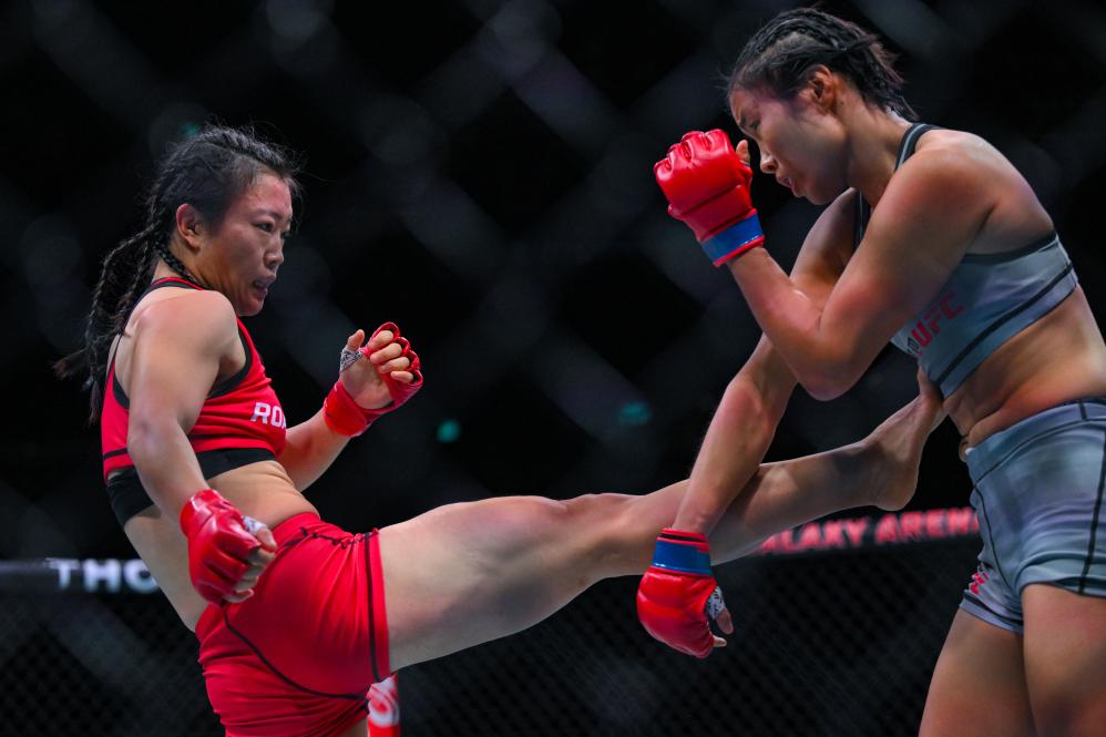11月23日,石銘(左)在比賽中。當(dāng)日,在2024年UFC格斗之夜澳門站精英之路女子草量級決賽中,石銘戰(zhàn)勝馮蕭燦。新華社記者 張金加 攝