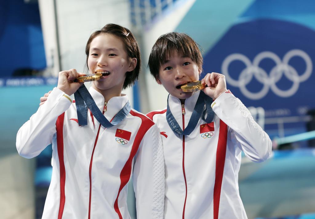 7月31日,冠軍中國選手陳芋汐(左)/全紅嬋在頒獎(jiǎng)儀式上。當(dāng)日,在巴黎奧運(yùn)會跳水女子雙人十米臺決賽中,陳芋汐/全紅嬋奪得金牌。新華社記者 張玉薇 攝