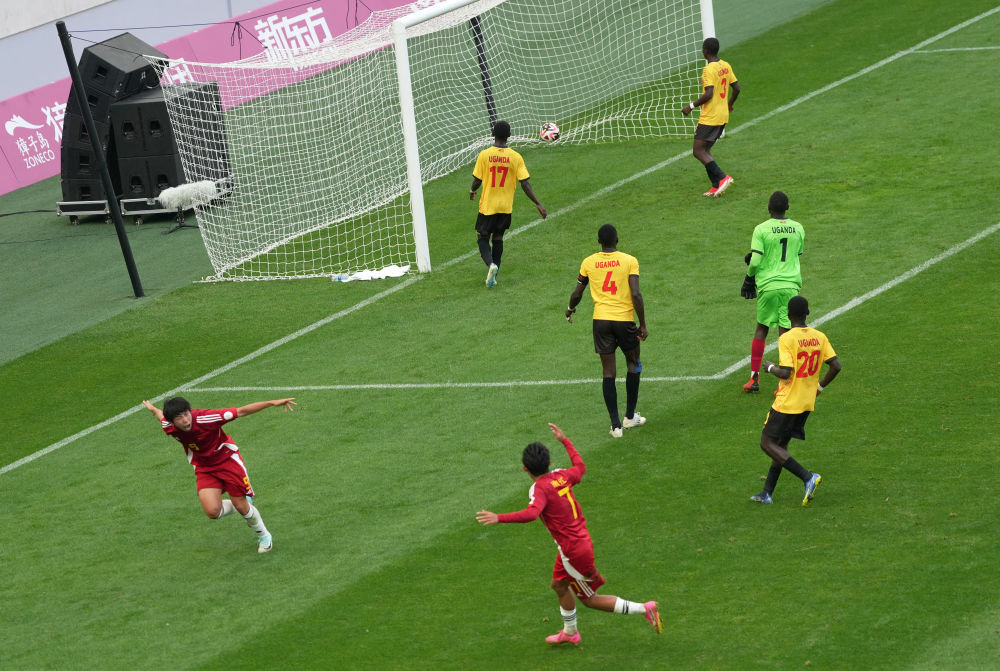2024年5月26日,中國男子一隊球員劉誠宇(左一)慶祝進(jìn)球。當(dāng)日,2024年國際中體聯(lián)足球世界杯賽落幕。中國男子一隊和中國女子二隊分別戰(zhàn)勝烏干達(dá)男子一隊和肯尼亞女子隊,雙雙奪冠。新華社記者 李鋼 攝