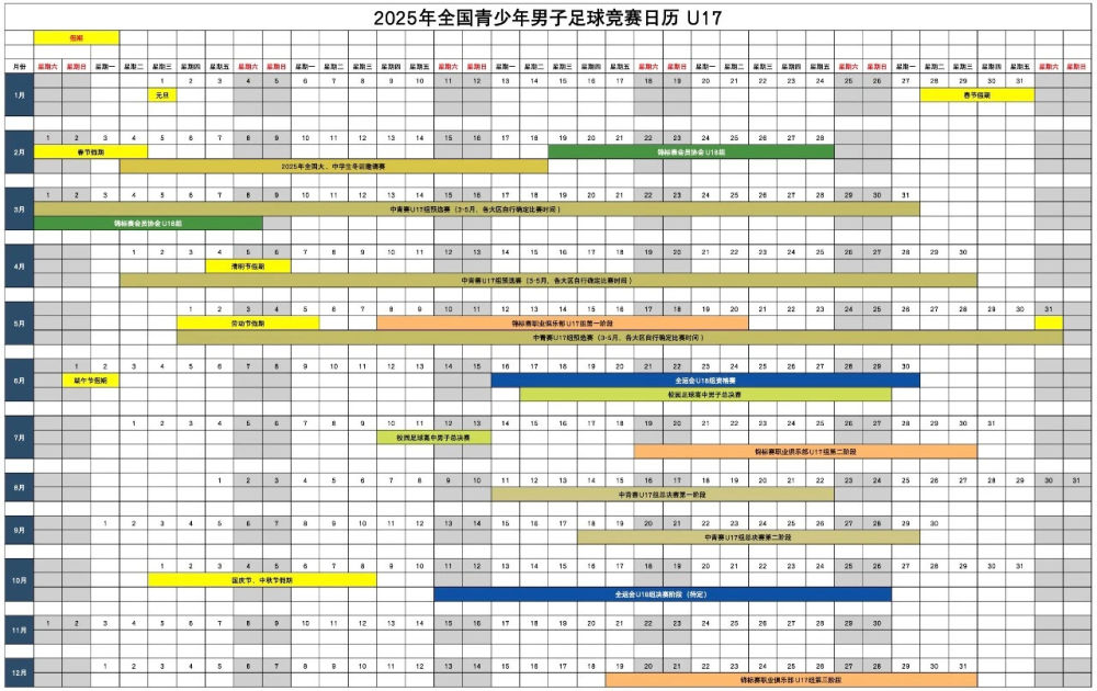 中國足協(xié)此次發(fā)布的統(tǒng)一賽歷涉及男子U13至U18共6個年齡段和女子U14至U18共5個年齡段的球員,包含中青賽、體校杯、職業(yè)俱樂部梯隊的比賽、校園足球高中男女總決賽等。不同賽事用不同顏色標(biāo)注,在表格中一目了然。中國足協(xié)青少部負(fù)責(zé)人程旭表示,這份賽歷是各部門共同推進(jìn)的結(jié)果,不僅有助于賽事統(tǒng)籌和優(yōu)化,也能更好地凝聚力量,完善人才培養(yǎng)。