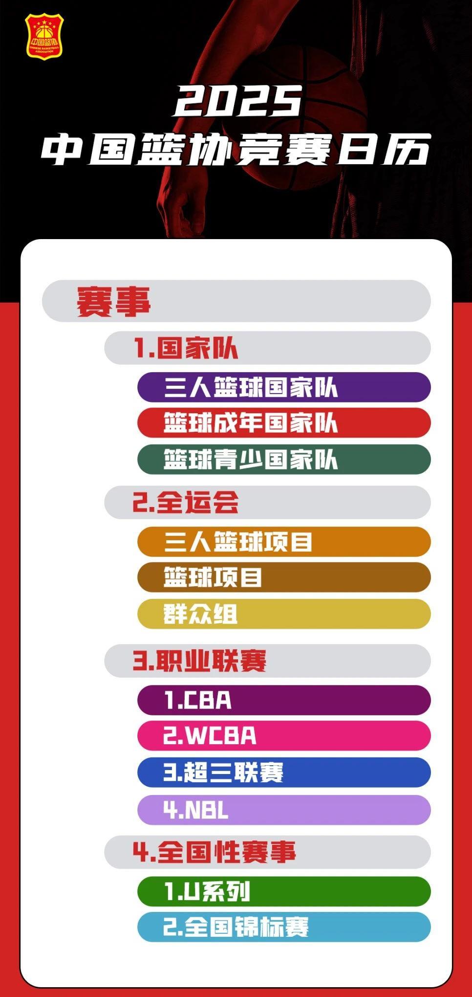 日前,中國籃球協(xié)會發(fā)布2025年的競賽日歷,所有賽事按照編排賽歷時的優(yōu)先程度分為5個層級,包括各級國際比賽、職業(yè)聯(lián)賽等。中國籃協(xié)相關(guān)人士表示,這次對外公布的只是前四個層級的已確定賽事。中國籃協(xié)和學(xué)體聯(lián)聯(lián)合主辦的一些教育系統(tǒng)的賽事屬于第五個層級,待有關(guān)細(xì)節(jié)確定后也會公布。