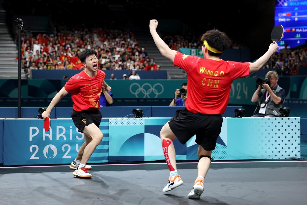 2024年8月9日,中國隊組合馬龍(左)/王楚欽慶祝勝利。當日,在巴黎奧運會乒乓球男團金牌賽中,中國隊戰(zhàn)勝瑞典隊,獲得冠軍。新華社記者 劉續(xù) 攝