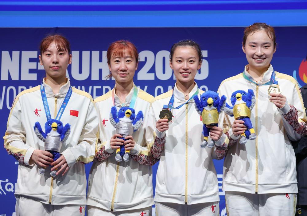 7月23日,冠軍中國隊(duì)選手穆文喆(中)、邢佳妮(左)和郭清在頒獎儀式上。新華社記者 李穎 攝