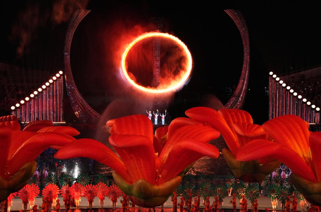新華社廣州11月10日電(記者王浩明、趙紫羽、田宇)9日晚,廣東奧林匹克體育中心,十五運(yùn)會的開幕式在這里舉行,當(dāng)十五運(yùn)會主火炬塔“天海之冠”被三地健兒共同點(diǎn)亮那一剎,燈火輝煌,掌聲雷動。