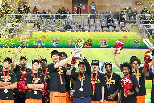2月12日,冠軍上海久事隊在頒獎儀式上慶祝。新華社記者 貝赫 攝