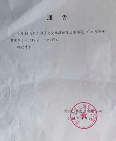 9月19日忻州城區(qū)公交線路按原線路運行,廣大市民免費乘車5天(19日——23日)。