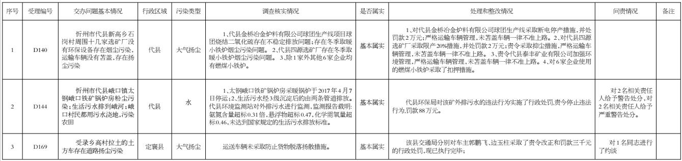 我市高度重視,立即組織查處,截至5月4日,督辦的3件群眾反映問(wèn)題已辦結(jié)。其中,代縣確認(rèn)基本屬實(shí)的2件;定襄縣確認(rèn)屬實(shí)的1件。對(duì)于屬實(shí)已辦結(jié)的環(huán)保問(wèn)題,分別采取了相應(yīng)處理措施,其中限產(chǎn)停產(chǎn)1件2家、查封扣押1件5家、罰款92.6萬(wàn)元;目前,代縣對(duì)2名相關(guān)責(zé)任人給予警告處分、2名相關(guān)責(zé)任人給予嚴(yán)重警告處分;定襄縣對(duì)1名相關(guān)責(zé)任人進(jìn)行了約談;對(duì)3件群眾反應(yīng)問(wèn)題調(diào)查處理情況進(jìn)行了信息公開。