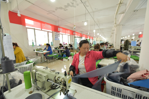 下茹越鄉(xiāng)的貧困戶蘇金娥是這家工廠的員工,“以前沒有工作,家里頭也挺困難,這會(huì)兒政府開設(shè)這個(gè)項(xiàng)目,我就過(guò)來(lái)試試,結(jié)果也挺好...這里有師傅教,每天可以學(xué)習(xí)...這幾天也熟練啦,每天可以做100多件,今年肯定能脫貧?!辈簧蒲赞o的蘇金娥在提到這份工作時(shí)滿臉笑容,斷斷續(xù)續(xù)的敘述中可以感受到她那喜悅的心情。