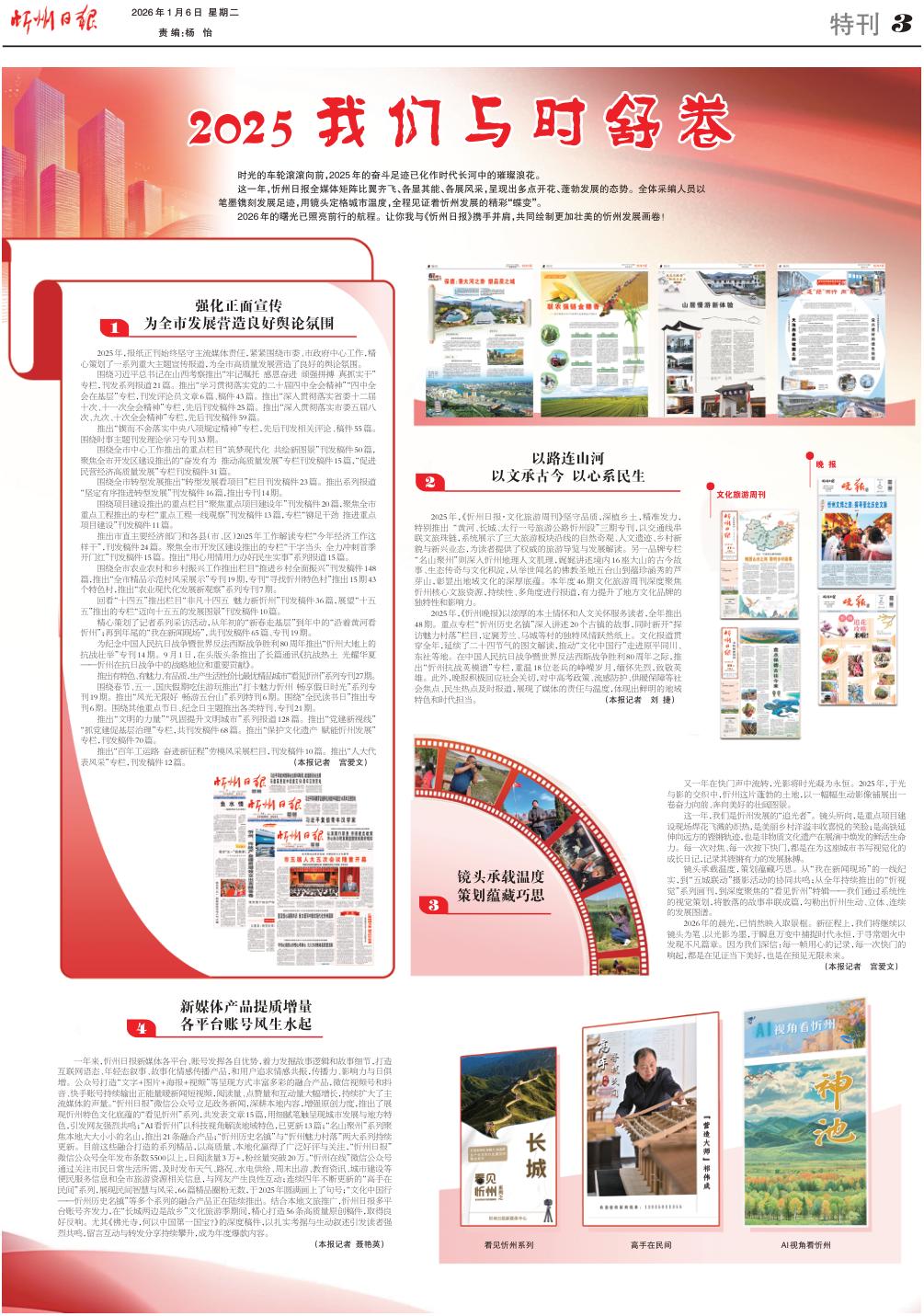 2025年,《忻州晚報(bào)》以濃厚的本土情懷和人文關(guān)懷服務(wù)讀者,全年推出48期。重點(diǎn)專欄“忻州歷史名鎮(zhèn)”深入講述20個(gè)古鎮(zhèn)的故事,同時(shí)新開“探訪魅力村落”欄目,定襄芳蘭、馬城等村的獨(dú)特風(fēng)情躍然紙上。文化報(bào)道貫穿全年,延續(xù)了二十四節(jié)氣的圖文解讀,推動(dòng)“文化中國行”走進(jìn)原平同川、東社等地。在中國人民抗日戰(zhàn)爭暨世界反法西斯戰(zhàn)爭勝利80周年之際,推出“忻州抗戰(zhàn)英模譜”專欄,重溫18位老兵的崢嶸歲月,緬懷先烈,致敬英雄。此外,晚報(bào)積極回應(yīng)社會(huì)關(guān)切,對中高考政策、流感防護(hù)、供暖保障等社會(huì)焦點(diǎn)、民生熱點(diǎn)及時(shí)報(bào)道,展現(xiàn)了媒體的責(zé)任與溫度,體現(xiàn)出鮮明的地域特色和時(shí)代擔(dān)當(dāng)。(本報(bào)記者劉捷)