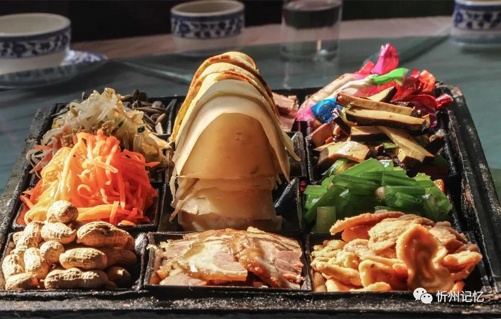 水菜盒子,是一個(gè)木制的長(zhǎng)方形盒子,長(zhǎng)約40多厘米,寬約20多厘米,高約10多厘米。木盒分蓋子和底座,底色多漆為紅黑兩色。蓋子上有的還畫(huà)有人物、山水、花卉等圖案,為描金漆處理。底座內(nèi)有12個(gè)木制的小長(zhǎng)方形碟子,以3行4列的形式排列,用來(lái)裝涼拌菜。傳統(tǒng)的涼拌菜為四葷、二素、六干果,但后來(lái)大多演變?yōu)樗娜潯⑺乃?、四干果。其中的“四葷”為雞蛋餅、冷片肉、蒸肉、鹵肉;“四素”幾乎全是清淡的蔬菜,如綠豆芽、胡蘿卜、土豆絲、菠菜、胡芹等;“六干果”分別是葵花子、水果糖、南瓜子、油蛋蛋、金銀棗、蝦片。在忻府區(qū),過(guò)去家家戶戶但凡婚喪嫁娶,總要上水菜盒子,這就是老忻州人好說(shuō)的“八八六六”。其中“八八”即水菜盒子(除去里面的干果正好8小碟菜),代表涼菜。