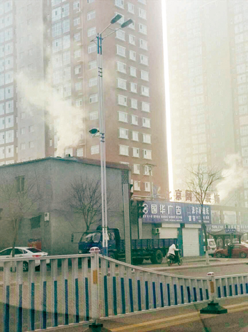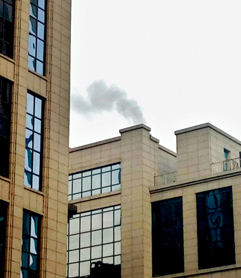 城區(qū)云中路瑞新裝飾城對面,有兩個煙囪冒煙,污染環(huán)境。城區(qū)七一路臨街一酒店樓頂有煙不斷冒出,而且味道嗆人。希望商戶或住戶配合治理,共同營造碧水藍(lán)天的良好環(huán)境。12月9日網(wǎng)友攝