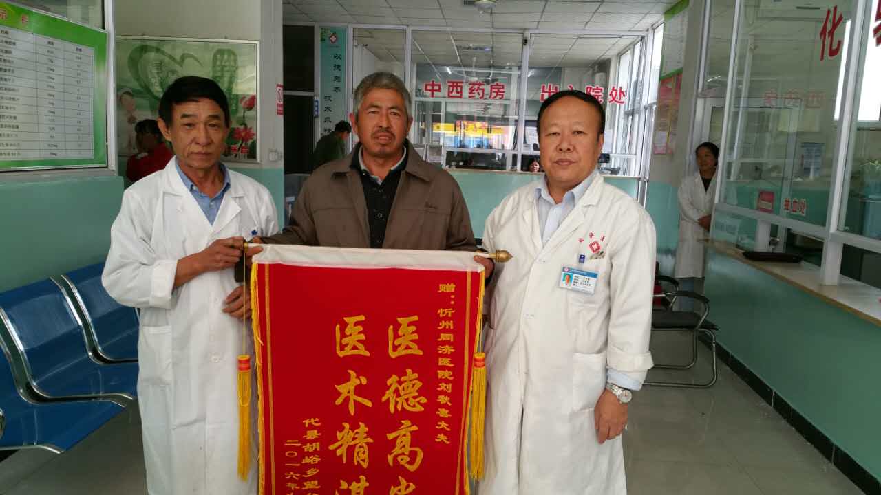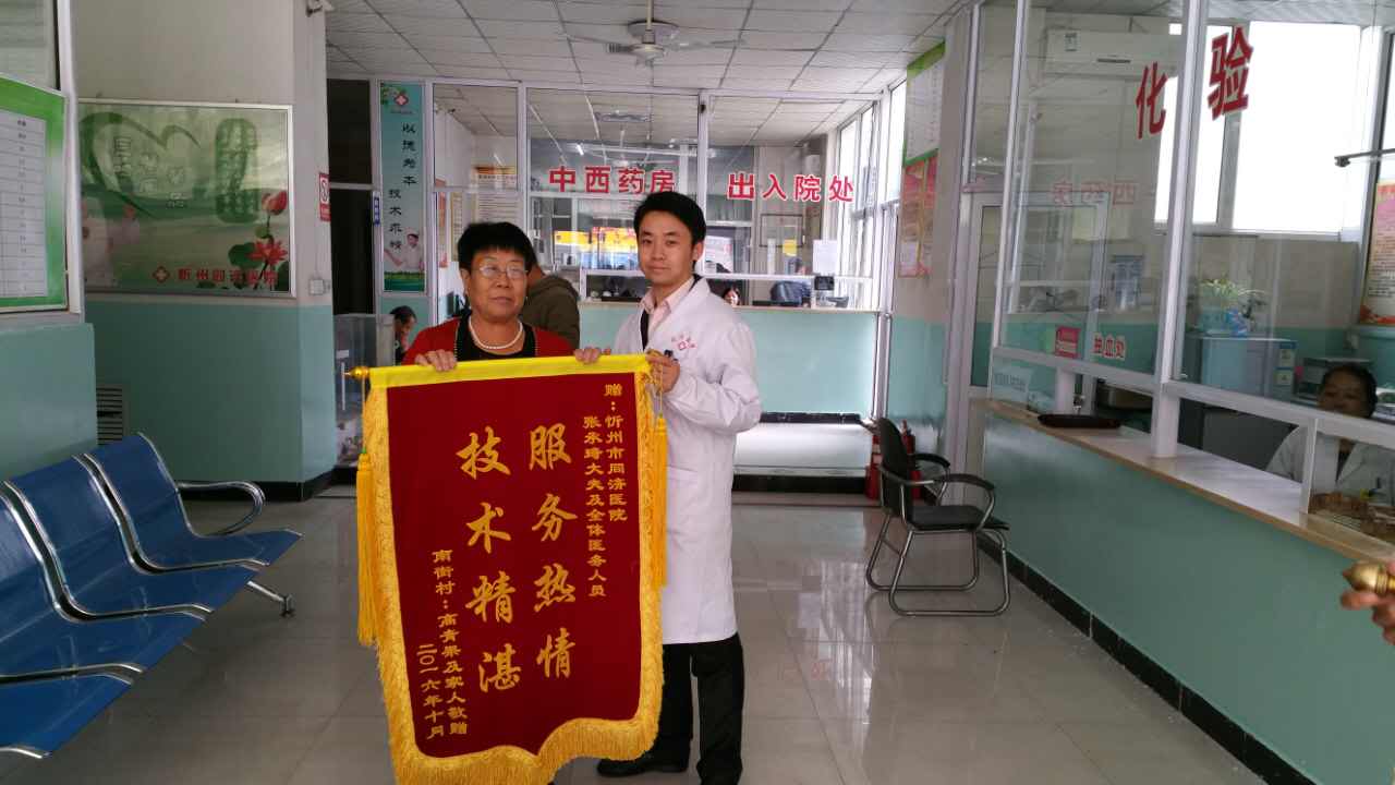 “謝謝您!張大夫,我現(xiàn)在精神好多了,睡眠也好了,吃飯也有胃口了……真是不知道怎樣感謝您才好?!?0月8日,位于忻州市光明西街的同濟醫(yī)院辦公室,高老先生夫婦握著張大夫的手激動地說。其妻子郝女士將早已準(zhǔn)備好的一面“服務(wù)熱情,醫(yī)術(shù)精湛”的錦旗送到張成喜大夫手中。同樣來自代縣胡峪鄉(xiāng)的賈先生也將一面寫有“醫(yī)德高尚,醫(yī)術(shù)精湛”的錦旗送到了該院寧院長手中。