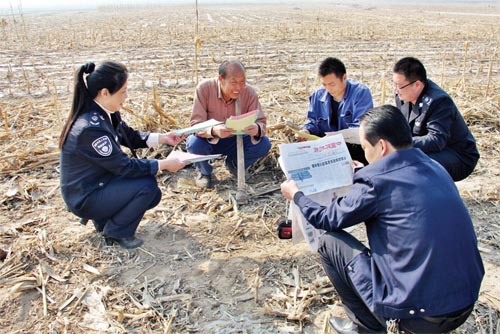 為了將《中華人民共和國大氣污染防治法》和《五臺縣人民政府嚴防森林火災(zāi)的通告》宣傳到戶、到人,五臺縣環(huán)保局組織工作人員,分組劃片深入到田間地頭,面對面讀報給農(nóng)民聽,為農(nóng)民解釋燒秸稈、燒荒等野外違規(guī)用火行為的危害。臺城鎮(zhèn)西關(guān)村66歲的農(nóng)民張存在說:“你們這樣解釋,咱懂。我家4畝地的秸稈保證不燒一根。”圖為五臺縣環(huán)保局工作人員在田間地頭宣傳環(huán)境保護相關(guān)知識。(金俊賢 辛宇 攝影報道)