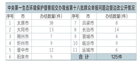 中央第一生態(tài)環(huán)境保護(hù)督察組交辦我省第十八批群眾舉報(bào)問題125件,辦結(jié)125件。公示125件,其中太原市38件、大同市13件、朔州市7件、忻州市9件、晉中市12件、陽泉市5件、呂梁市8件、長(zhǎng)治市14件、晉城市4件、臨汾市9件、運(yùn)城市6件??傻卿浬轿魇∪嗣裾W(wǎng)站或掃描二維碼查閱群眾信訪舉報(bào)轉(zhuǎn)辦和邊督邊改公開情況一覽表。