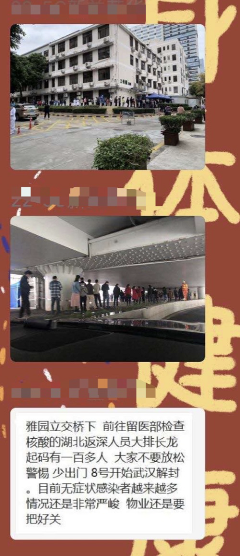 “雅園立交橋下,前往留醫(yī)部檢查核酸的湖北返深人員大排長龍,起碼有一百人,大家不要放松警惕,少出門?!?日,這段文字和兩張大排長龍的圖片在網(wǎng)上流傳。記者9日從深圳市人民醫(yī)院獲悉,該情況并不屬實。一份核酸取樣平均時間為數(shù)秒鐘,醫(yī)院核酸檢測排隊患者一般在10~50人之間,因為需要保持1米隔離,隊伍會比較長,但也未超過百米,更不存在排出醫(yī)院大門外或雅園立交橋下,市民無需緊張。