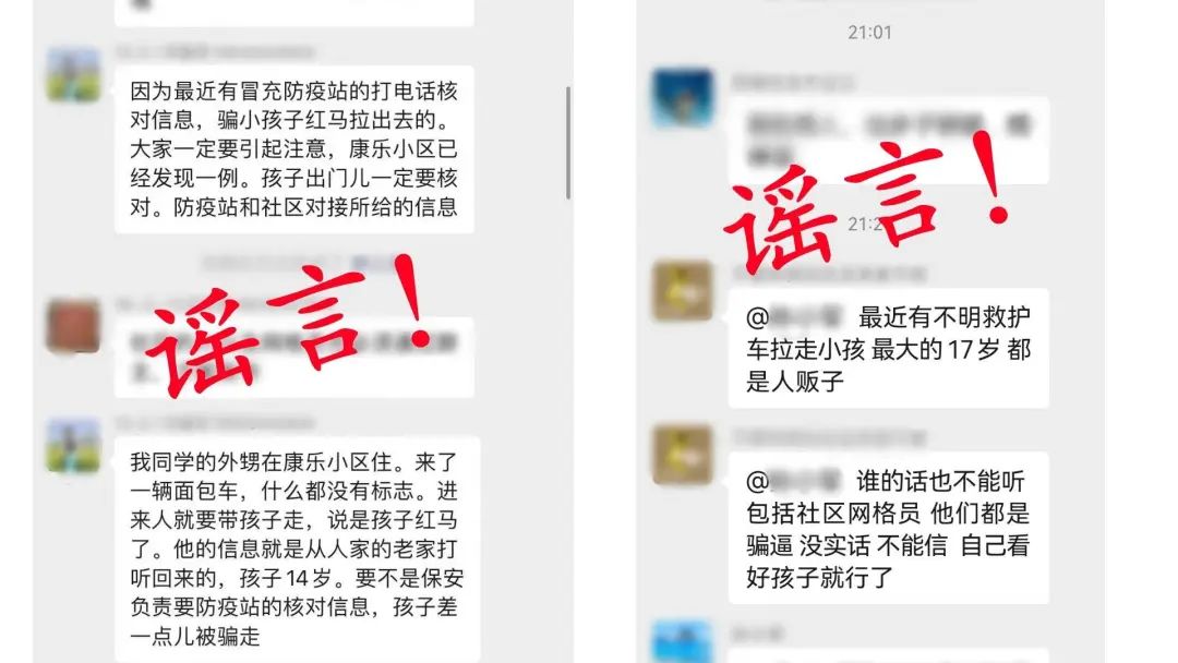 近日,本地微信群傳播:“最近有冒充防疫站的打電話核對(duì)信息,騙小孩紅馬拉出去的。大家一定要引起注意,康樂(lè)小區(qū)已經(jīng)發(fā)現(xiàn)一例”、“最近有不明救護(hù)車?yán)咝『?,最大?7歲,都是人販子”。