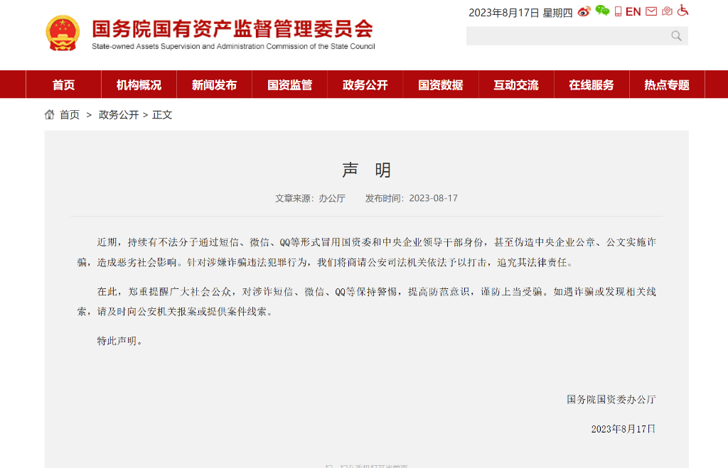 國務院國資委辦公廳8月17日在國務院國資委官網發(fā)布聲明稱,近期,持續(xù)有不法分子通過短信、微信、QQ等形式冒用國務院國資委和中央企業(yè)領導干部身份,甚至偽造中央企業(yè)公章、公文實施詐騙,造成惡劣社會影響。針對涉嫌詐騙違法犯罪行為,國務院國資委將商請公安司法機關依法予以打擊,追究其法律責任。