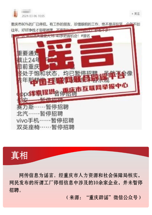 搭蹭熱點散播民生類謠言,渲染焦慮。3月,全國兩會召開,“民生清單”熱度高?!按赫小薄按河巍钡葧r間節(jié)點,有關(guān)招工就業(yè)、疫病傳染等內(nèi)容也成為個別網(wǎng)民博眼球的素材。一些個人或自媒體歪曲甚或虛構(gòu)事實,編造散布社會民生謠言,引發(fā)公眾不必要的焦慮。如,別有用心者惡意虛構(gòu)事實,發(fā)布“重慶80%的工廠暫停招聘”“湖南郴州疫情卷土重來”等虛假信息,渲染負(fù)面情緒、徒增公眾憂慮、擾亂社會秩序;還有人為吸引流量、博取關(guān)注,根據(jù)主觀臆想,采取移花接木等手段,散播“京滬高速公路停止收費”“浙江麗水機(jī)場已建成投用并首航”“重慶合川太和飛機(jī)場正式開建”等涉重大基礎(chǔ)設(shè)施建設(shè)項目的假消息,誤導(dǎo)公眾認(rèn)知,擾亂群眾交通出行秩序。