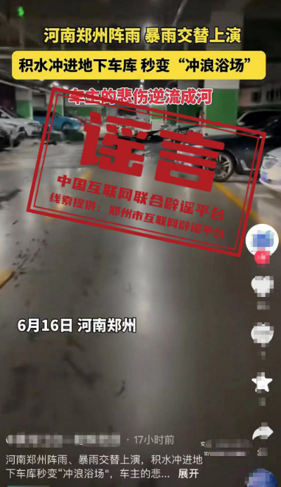 真相:近日,網(wǎng)上流傳內(nèi)容為“6月16日,河南鄭州,積水沖進地下車庫”的視頻。經(jīng)鄭州市金水區(qū)文化路辦事處證實,該視頻首發(fā)于2021年7月,并非2024年6月16日發(fā)生,視頻顯示畫面亦非視頻定位所在小區(qū),該小區(qū)并未發(fā)生地下車庫進水情況。以上信息內(nèi)容不實,系翻炒舊聞。(來源:鄭州市互聯(lián)網(wǎng)舉報和辟謠平臺)