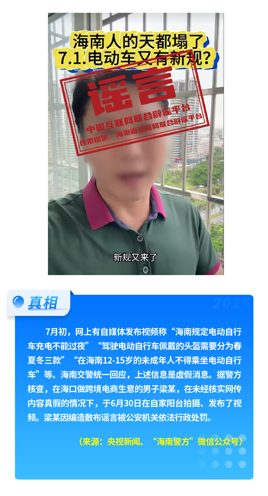 有人重新翻炒“醫(yī)?!畟€(gè)人賬戶’將全部取消”舊謠,故意歪曲醫(yī)保改革真實(shí)內(nèi)涵,嚴(yán)重誤導(dǎo)公眾對(duì)醫(yī)保改革政策的理解?!坝袑H松祥T(mén)服務(wù)激活醫(yī)保碼”,披著“公共服務(wù)”的外衣,實(shí)有詐騙之嫌和安全風(fēng)險(xiǎn)。憑空捏造“海南規(guī)定電動(dòng)自行車充電不能過(guò)夜、頭盔分三季”這一“奇葩規(guī)定”,以“新規(guī)”話術(shù),擾亂交通管理秩序。