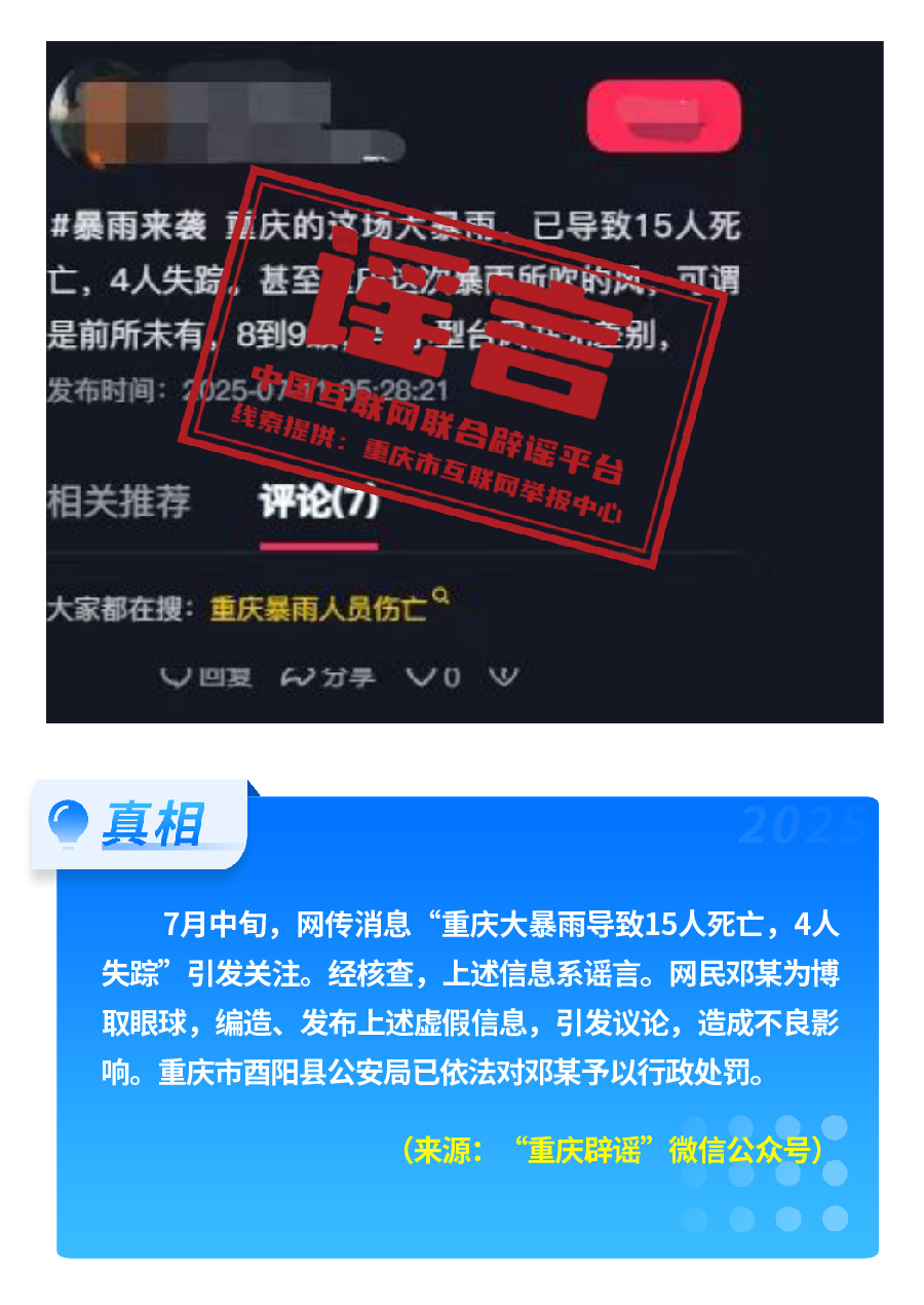 近期,網(wǎng)上接連出現(xiàn)發(fā)布虛假“警情通報(bào)”的惡性造謠傳謠案件,炮制傳播“昆明駕車撞人案131人死亡”“杭州自來(lái)水接入糞水”及涉釋永信虛假“警情通報(bào)”,模仿“藍(lán)底白字”格式,杜撰聳人聽(tīng)聞細(xì)節(jié),損害政府公信力,嚴(yán)重?cái)_亂社會(huì)秩序?!霸菏款A(yù)測(cè)廣東將發(fā)生8級(jí)以上大地震”公然偽造專家聊天截圖,謊報(bào)地震預(yù)警。還有造謠者借盛夏高溫酷暑與洪澇災(zāi)害,編造“安徽淮北、山東泰安等地多人因高溫死亡” “重慶大暴雨導(dǎo)致15人死亡、4人失蹤”等謠言,蹭炒熱點(diǎn)、煽動(dòng)情緒。
