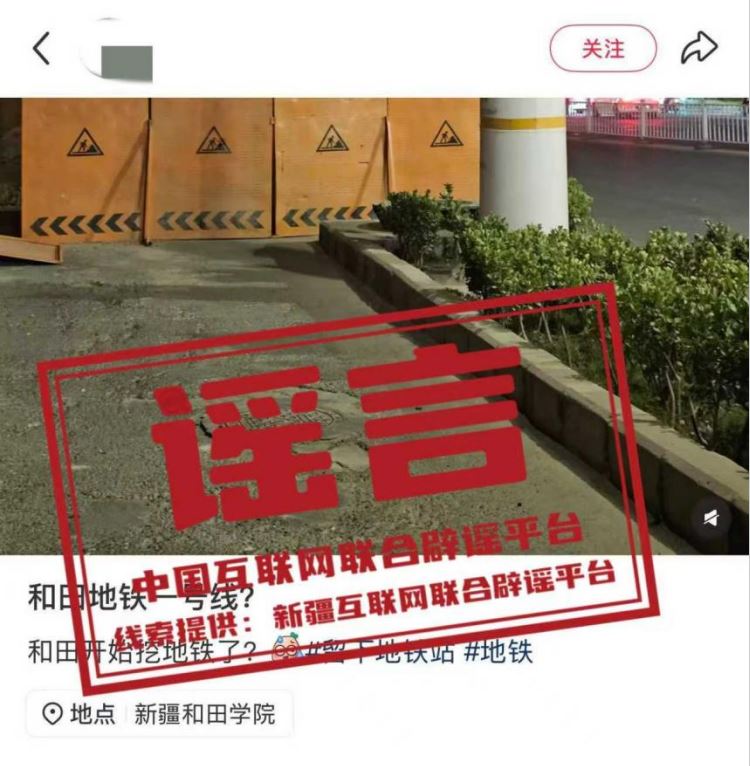 真相:近日,有網(wǎng)民發(fā)布消息稱“新疆和田要建地鐵一號線?開始挖地鐵了?”,并配以道路施工圖片,引發(fā)關(guān)注。經(jīng)和田市交通運輸局核實,網(wǎng)傳信息系謠言,截至目前,未收到任何關(guān)于和田市開挖地鐵的工作通知或確認(rèn)信息。(來源:“新疆網(wǎng)絡(luò)辟謠”微信公眾號)