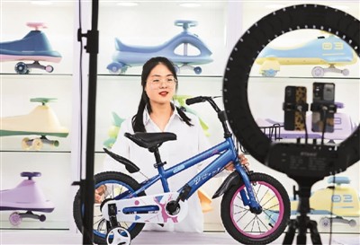 河北省邢臺市廣宗縣鐵牛自行車業(yè)有限公司的工作人員日前通過線上廣交會(huì)直播推介童車產(chǎn)品。王 壘攝(人民圖片)