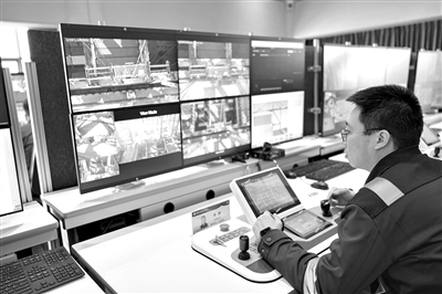 在天津港全物聯(lián)網(wǎng)集裝箱碼頭智控中心,工作人員遠(yuǎn)程操控碼頭機(jī)械設(shè)備。 新華社記者 張鋮 攝
