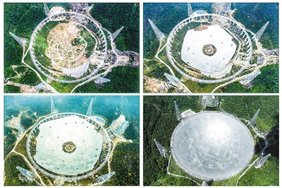 這是一張拼版照片:依次為“中國天眼”拼裝第一塊反射面板(左上,2015年8月2日攝)、“中國天眼”反射面板安裝近半(右上,2015年12月16日攝)、“中國天眼”反射面板安裝近八成(左下,2016年3月9日攝)、維護保養(yǎng)期間的“中國天眼”(右下,2022年7月21日攝)。新華社記者 歐東衢攝