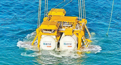 在海南省陵水黎族自治縣英州鎮(zhèn)清水灣的海面上,一艘起重船巨臂高擎,緩緩下落。船上,工作人員緊盯著潛水控制臺的屏幕,手中精準操作,重達1300噸的“海底數(shù)據(jù)艙”穩(wěn)穩(wěn)沉入35米深的海底。