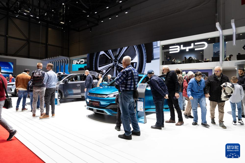 這是2月28日在瑞士日內(nèi)瓦舉行的2024年日內(nèi)瓦國際車展上拍攝的比亞迪展臺(tái)。新華社記者孟鼎博 攝