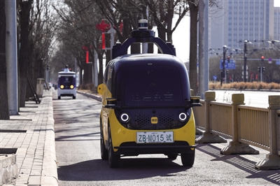 圖為兩輛無(wú)人車正在北京經(jīng)濟(jì)技術(shù)開發(fā)區(qū)街頭行駛。 新華社記者 鞠煥宗 攝