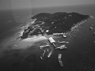 圖為直升機(jī)空中游覽過(guò)程中拍攝的三亞蜈支洲島。 記者 周慧敏 攝