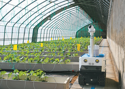 3月21日,無人巡檢機器人在天津一家智慧農業(yè)園區(qū)內巡控。新華社記者 孫凡越攝