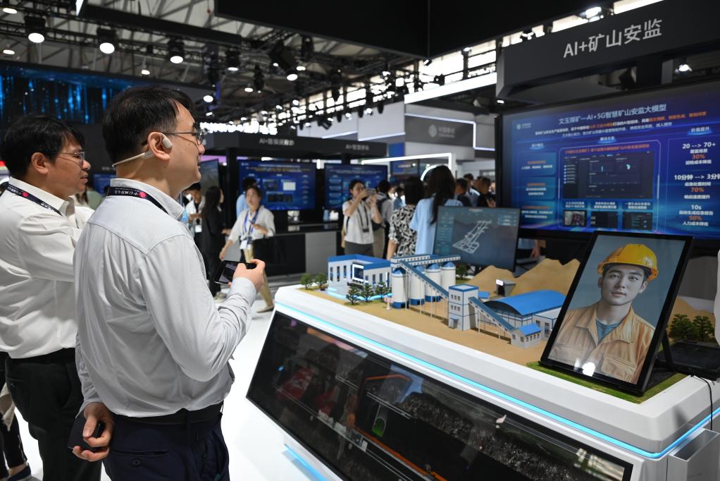 6月18日,觀眾在中國移動展臺了解“AI+礦山安監(jiān)”技術方案。新華社記者 陳愛平 攝