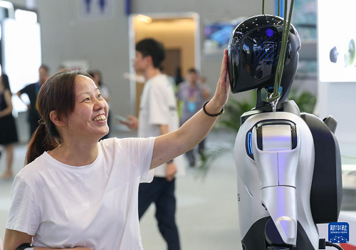 9月5日,觀眾在2025世界智能產(chǎn)業(yè)博覽會(huì)上觸摸人形機(jī)器人。新華社記者 陳誠(chéng) 攝