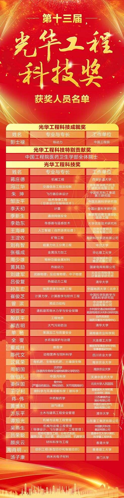 人民網(wǎng)北京11月9日電(趙竹青)8日,由中國(guó)工程院發(fā)起,被譽(yù)為“中國(guó)工程界最高獎(jiǎng)項(xiàng)”的第十三屆光華工程科技獎(jiǎng)名單在京揭曉。今年,光華工程科技成就獎(jiǎng)由核動(dòng)力專家彭士祿獲得,光華工程科技特別貢獻(xiàn)獎(jiǎng)?lì)C發(fā)給了為抗疫做出重大貢獻(xiàn)的中國(guó)工程院醫(yī)藥衛(wèi)生學(xué)部全體院士,另有39位專家因在各自領(lǐng)域取得突出成績(jī)而榮膺光華工程科技獎(jiǎng)。 本屆光華工程科技獎(jiǎng)的獲獎(jiǎng)科學(xué)家們,緊密圍繞國(guó)家重大戰(zhàn)略需求,瞄準(zhǔn)經(jīng)濟(jì)建設(shè)和事關(guān)國(guó)家安全的重大工程科技問(wèn)題,緊貼新時(shí)代社會(huì)民生現(xiàn)實(shí)需求,加快自主創(chuàng)新成果轉(zhuǎn)化應(yīng)用,為創(chuàng)新驅(qū)動(dòng)發(fā)展,建設(shè)科技強(qiáng)國(guó),以及實(shí)現(xiàn)“兩個(gè)一百年”奮斗目標(biāo)和中國(guó)夢(mèng)做出了重要貢獻(xiàn)。 其中,中國(guó)工程院核動(dòng)力專家彭士祿獲得光華工程科技成就獎(jiǎng),他主持設(shè)計(jì)建造了我國(guó)第一座核潛艇陸上模式堆、成功研制第一艘核潛艇、組織引進(jìn)第一座百萬(wàn)千瓦級(jí)核電站、指揮自主設(shè)計(jì)建造第一座大型商用核電站,為我國(guó)核潛艇實(shí)現(xiàn)從無(wú)有的歷史性突破、第一座核電站技術(shù)路線確定做出了突出貢獻(xiàn),是中國(guó)核動(dòng)力領(lǐng)域開(kāi)拓者和奠基者之一。 鐘南山、張伯禮等中國(guó)工程院醫(yī)藥衛(wèi)生學(xué)部全體院士獲得光華工程科技特別貢獻(xiàn)獎(jiǎng),以此表彰醫(yī)藥衛(wèi)生學(xué)部院士們?yōu)榇蜈A新冠疫情防控阻擊戰(zhàn)發(fā)揮的重要作用,在這場(chǎng)艱巨的戰(zhàn)役中,他們奮不顧身沖鋒陷陣,在疾病診療、快速檢測(cè)、應(yīng)急預(yù)警、科普宣傳、復(fù)工復(fù)產(chǎn)等方面提供了有力科技支撐。 此外,還有機(jī)械工程專家蔣莊德、計(jì)量專家李天初、人工智能專家王海峰、特種功能金屬材料專家周少雄等不同學(xué)科領(lǐng)域的39位專家獲得光華工程科技獎(jiǎng),這些專家均以非凡的積極性和創(chuàng)造性,在各自領(lǐng)域取得了傲人成績(jī),為我國(guó)工程科學(xué)技術(shù)事業(yè)的發(fā)展做出了巨大貢獻(xiàn)。 據(jù)介紹,根據(jù)光華工程科技獎(jiǎng)候選人提名要求,候選人需在重大工程設(shè)計(jì)、研制、建造、生產(chǎn)、運(yùn)行、管理等方面解決關(guān)鍵科學(xué)技術(shù)問(wèn)題或在工程科學(xué)技術(shù)及工程管理領(lǐng)域有重要發(fā)現(xiàn)、發(fā)明,并有顯著應(yīng)用成效,或者是應(yīng)用本人研究成果、發(fā)明創(chuàng)造,發(fā)展高新技術(shù)及相關(guān)產(chǎn)業(yè),成效特別顯著者才可提名。今年,全國(guó)范圍內(nèi)共產(chǎn)生了296名有效候選人。