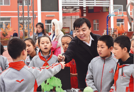 圖為崔文龍正在和學(xué)生進(jìn)行課間互動(dòng)。