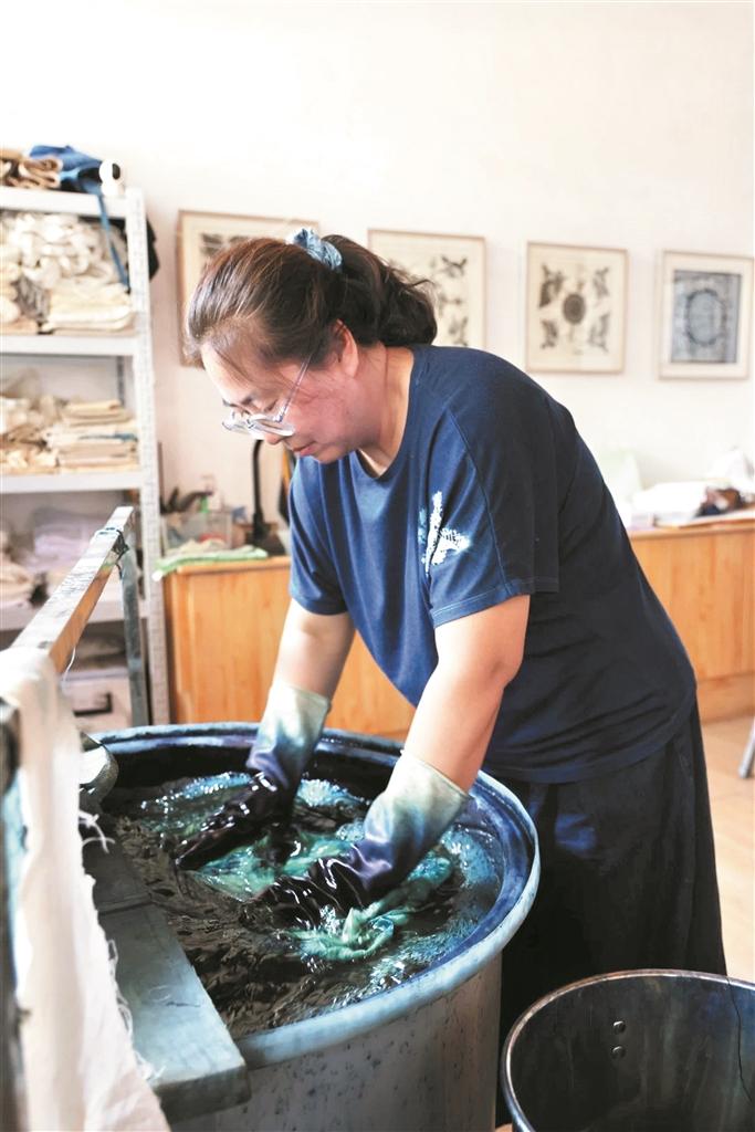 然而,當夢想照進現(xiàn)實,前行的路總是充滿坎坷。由于前期投入大,入不敷出的經濟狀況讓她犯了難,為了支撐店鋪運營,她不僅賣了房子,還貸了款?!半m然丈夫不支持,但是好在兒子很支持,最讓我欣慰的是,他常驕傲地跟別人介紹,‘這是我媽媽染的’‘我媽媽是非遺傳承人’,也正是這些,在我動搖、想要放棄的時候,我選擇堅持下去。”說到動情處,趙慧言語滿是幸福。