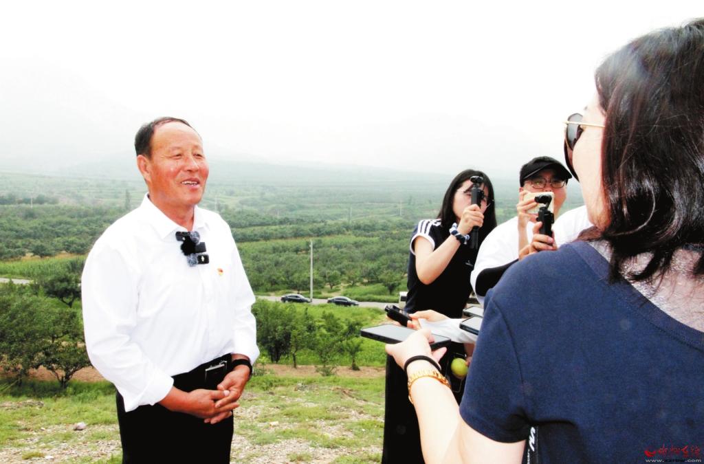 在萬畝玉露香酥梨基地觀景臺上,栗翠田(左一)接受“三晉人大代表采風(fēng)行”記者采訪張林泉攝