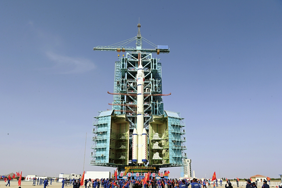 圖為5月22日,神舟十六號(hào)載人飛船與長(zhǎng)征二號(hào)F遙十六運(yùn)載火箭組合體轉(zhuǎn)運(yùn)至發(fā)射塔架。