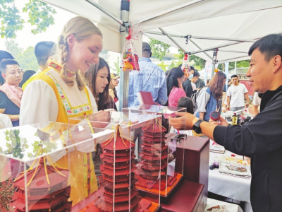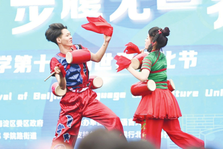 當(dāng)日活動(dòng)吸引了來(lái)自世界各地的3萬(wàn)余名師生及社會(huì)各界人士。獨(dú)唱《人說(shuō)山西好風(fēng)光》《千年一塔》,舞蹈《醋之韻》《翼城花鼓》等贏得師生們熱烈掌聲。在五大洲文化展區(qū),絳州木版年畫傳承人吳百鎖現(xiàn)場(chǎng)印制木版年畫贈(zèng)送師生,成為一道亮麗風(fēng)景。廣靈剪紙、應(yīng)縣木塔模型、黎侯虎、寧武毛健茶等吸引各國(guó)留學(xué)生駐足欣賞?!叭A夏古文明山西好風(fēng)光”主題相框前,無(wú)數(shù)外國(guó)友人饒有興趣交流互動(dòng),拍照留念?!吧轿髟亍被鸨本┱Z(yǔ)言大學(xué)世界文化節(jié)。