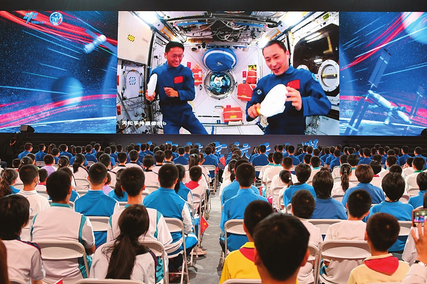 9月21日下午,“天宮課堂”第四課在中國(guó)空間站開講,新晉“太空教師”景海鵬、朱楊柱、桂海潮為廣大青少年帶來一場(chǎng)精彩的太空科普課,這是中國(guó)航天員首次在夢(mèng)天實(shí)驗(yàn)艙內(nèi)進(jìn)行授課。