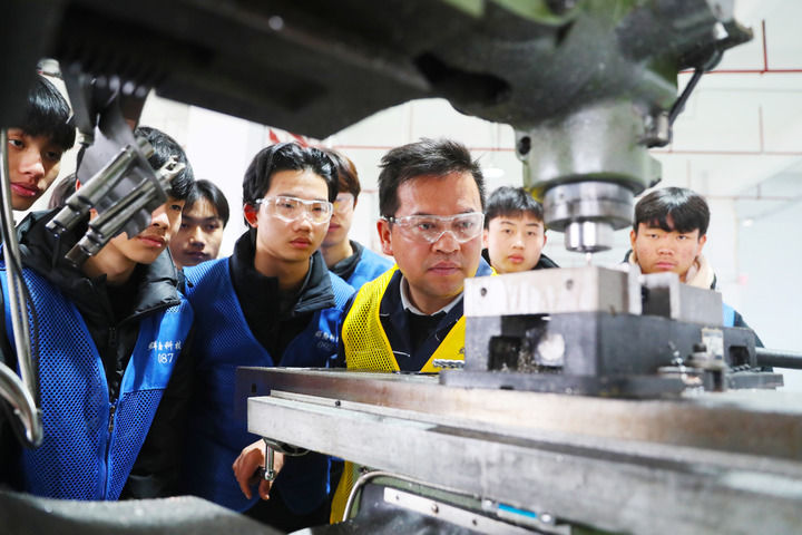 2024年1月9日,在湖南省永州市新田縣產(chǎn)業(yè)開發(fā)區(qū)永州群翰科技有限公司車間,新田縣職業(yè)中等專業(yè)學校學生在工廠師傅的指導下學習機床操作技術(shù)。近年來,該校聯(lián)合企業(yè)開展“產(chǎn)教融合、校企辦學”模式,助推就業(yè)創(chuàng)業(yè)。新華社發(fā)(劉貴雄 攝)