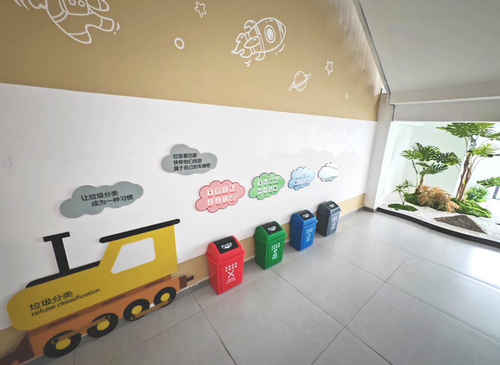 3月28日,悅?cè)菪W(xué)教學(xué)樓內(nèi)的垃圾分類(lèi)箱。新華社記者楊帆攝