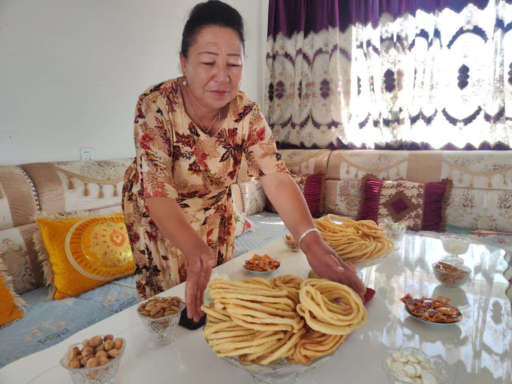 6月30日,烏什縣亞曼蘇柯爾克孜族鄉(xiāng)尤勒吐孜布拉克村居民阿曼古麗·熱合曼正在新居里準(zhǔn)備茶點(diǎn)。新華社記者 關(guān)俏俏 攝