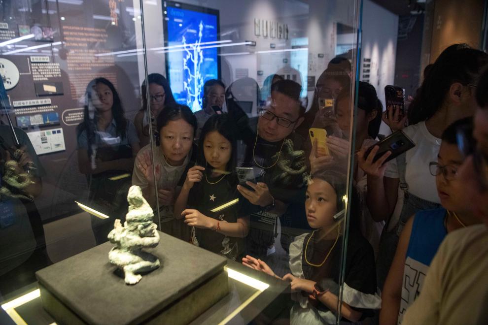 在四川廣漢三星堆博物館文物保護(hù)與修復(fù)館,游客在“匠心妙手——三星堆遺址新出土文物保護(hù)修復(fù)成果展示”試開放期參觀(7月22日攝)。新華社記者 唐文豪 攝