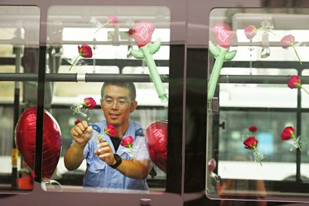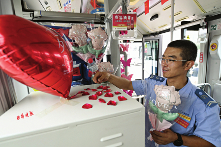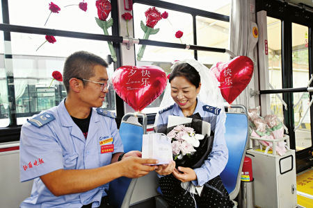 七夕節(jié)即將到來(lái),8月8日,在太原公交第三汽車(chē)分公司,公交車(chē)廂里上演了一場(chǎng)別樣的浪漫——堅(jiān)守在一線(xiàn)的兩名公交司機(jī)閻樹(shù)德和焦更新,分別為出車(chē)回來(lái)的妻子準(zhǔn)備了大大的驚喜。用送花、提前準(zhǔn)備飯菜、布置車(chē)廂等行動(dòng)表達(dá)自己的愛(ài)意。