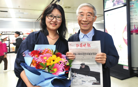 在接站口,“姥爺”接過記者遞上的鮮花,看到刊載報道他的4月2日的報紙,咧嘴一笑,一再說“謝謝,謝謝”,記者用鏡頭和文字記錄下這份喜悅。交城縣委宣傳部也派出了接機(jī)小分隊,打著“我們愛你,山西姥爺”等歡迎牌,把姥爺護(hù)送回家。