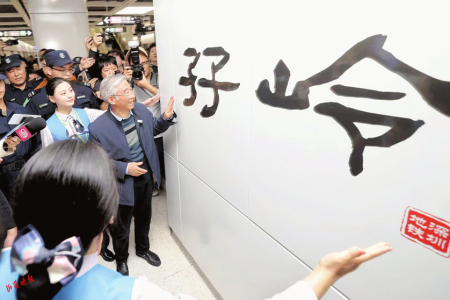 崗廈北站是深圳交通網(wǎng)絡(luò)中的重要節(jié)點(diǎn),設(shè)計獨(dú)具匠心,通過天井將陽光引入地下,科技感和藝術(shù)性兼具,被譽(yù)為“深圳之眼”。在崗廈北站樞紐的“深圳之眼”下,姥爺即興揮毫,寫下“情滿鵬城”“厚德載運(yùn),深鐵為民”。墨跡未干,照片已登上熱搜。
